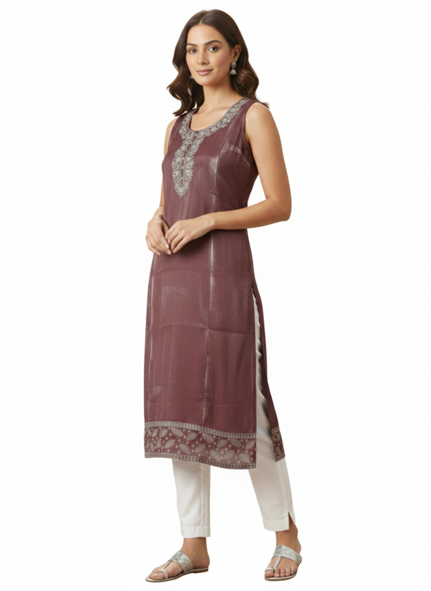 A deep plum sleeveless Kurti crafted from smooth silk-blend fabric. It features ...