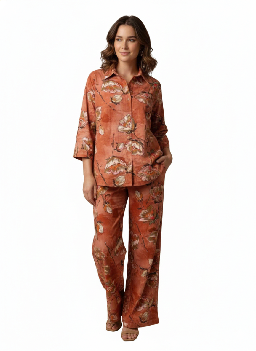 A terracotta floral co-ord set featuring a button-down shirt with 3/4 sleeves an...
