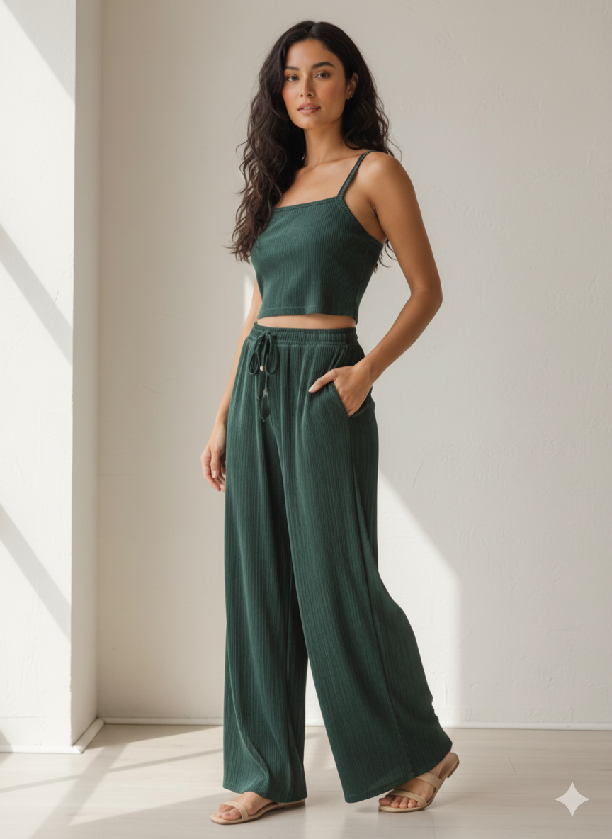 The Outfit: A coordinated two-piece set in a Forest Green ribbed fabric. It incl...