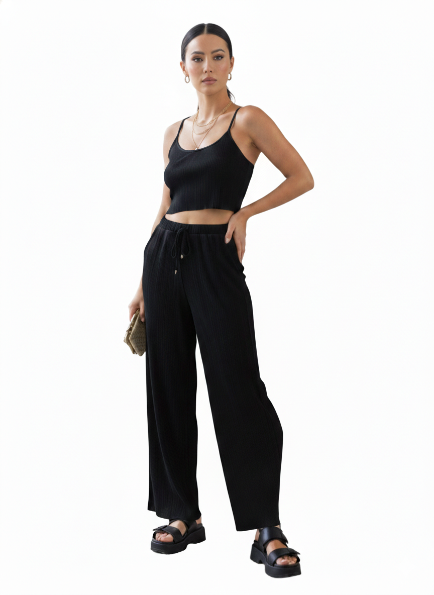 The Outfit: A coordinated two-piece set in a Black ribbed fabric. It includes a ...